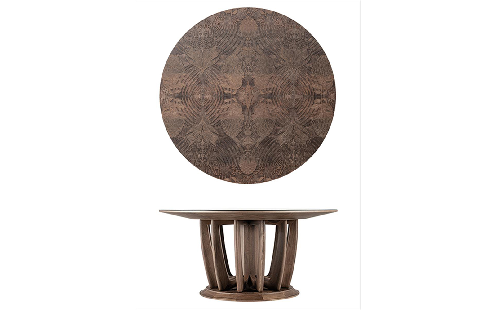 Masă rotundă TROPICANA – lemn masiv de nuc sculptat, cu design sculptural și finisaj artistic