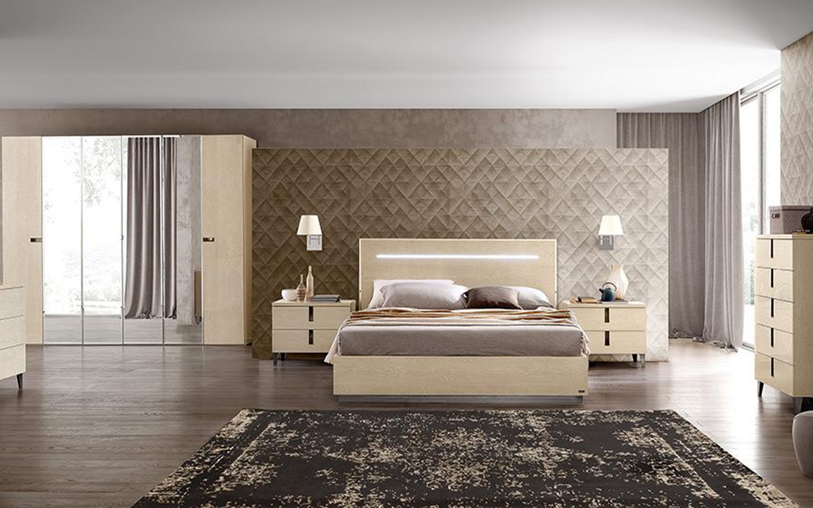 Patul Almira este disponibil în două dimensiuni, adaptate atât dormitoarelor de dimensiuni medii, cât și celor mai spațioase, oferind flexibilitate în amenajare. Dimensiunile totale sunt integrate armonios în design, fără a încărca vizual spațiul, păstrând un echilibru între volum și proporții.