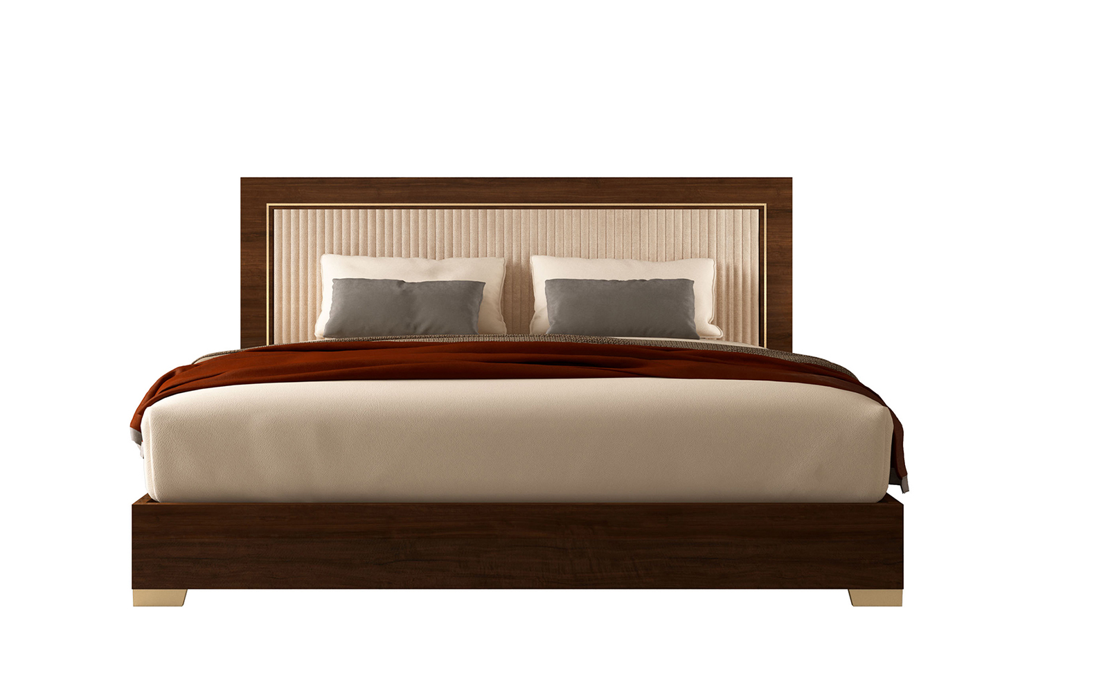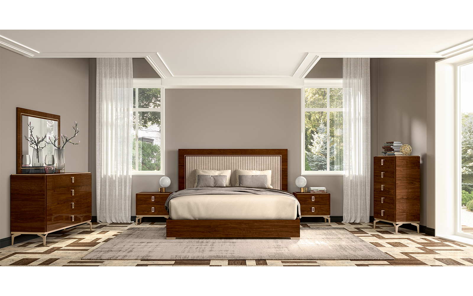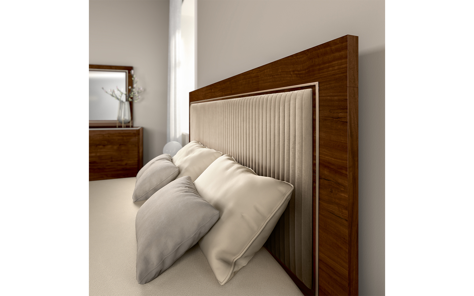 Lemnul cald, accentele metalice subtile și catifeaua bej transformă orice dormitor într-un spațiu de relaxare premium.
