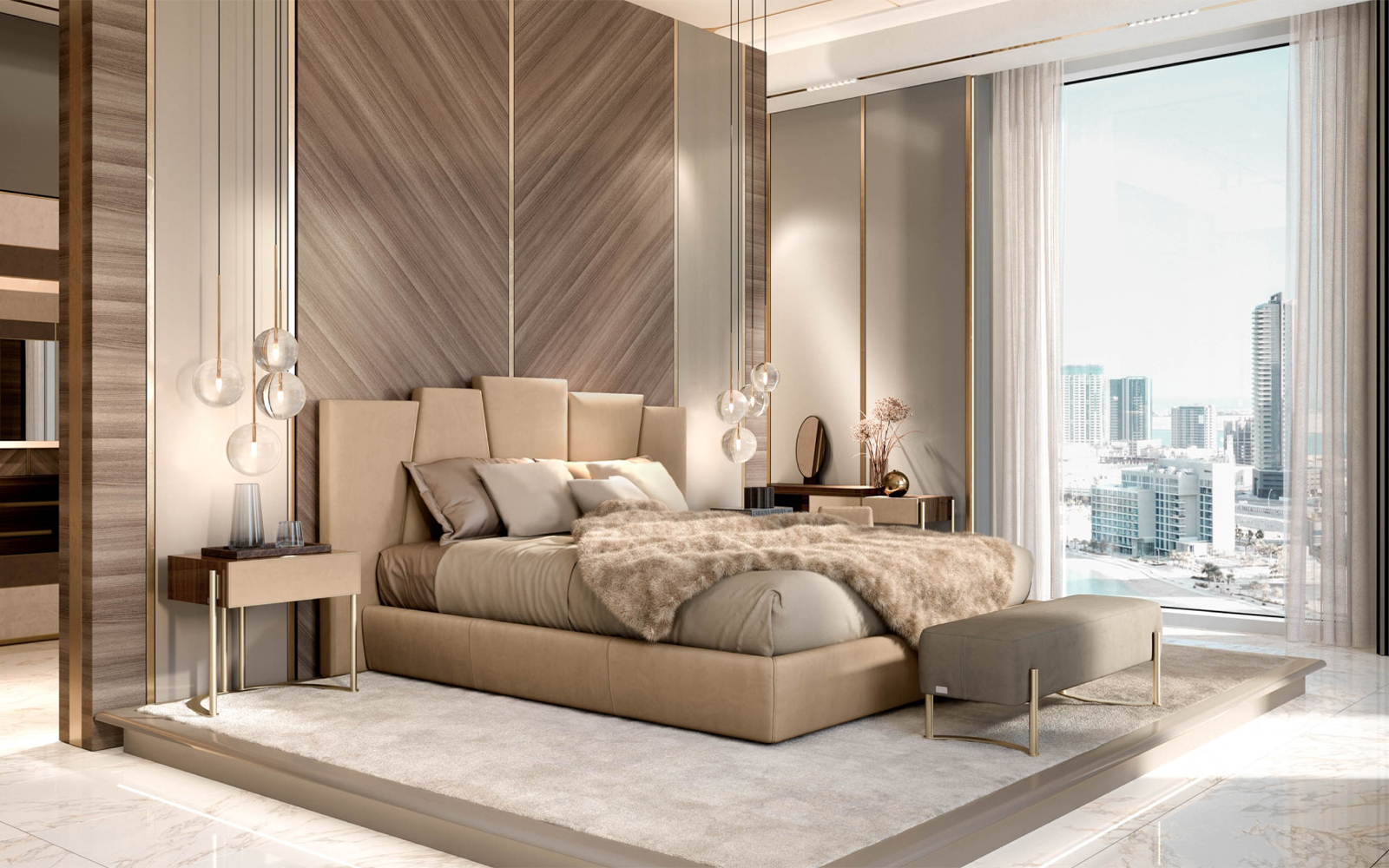 Baza patului este supradimensionată față de saltea pentru a crea un aspect compact și echilibrat vizual, iar designul discret al bazei pune în valoare tăblia. Suitabil atât pentru spații rezidențiale de lux, cât și pentru amenajări de hoteluri boutique sau apartamente high-end, acest pat îmbină estetica rafinată cu funcționalitatea.