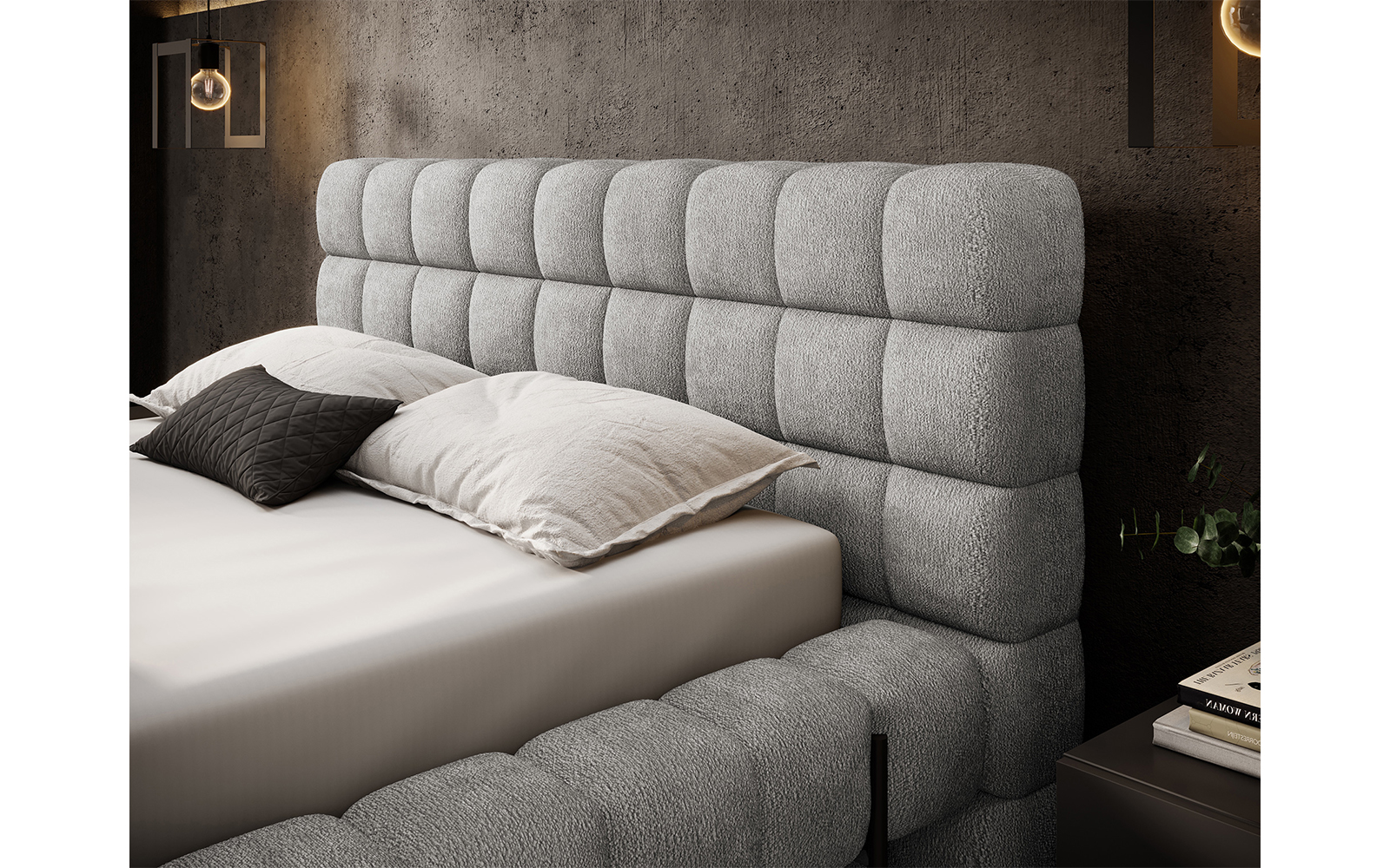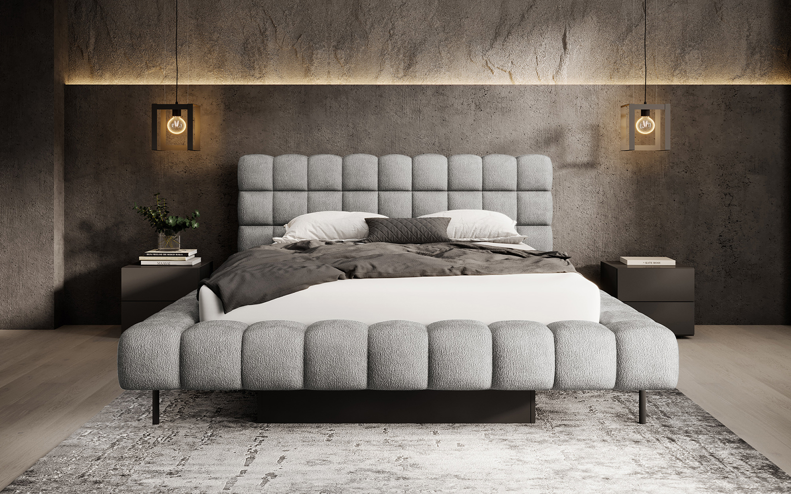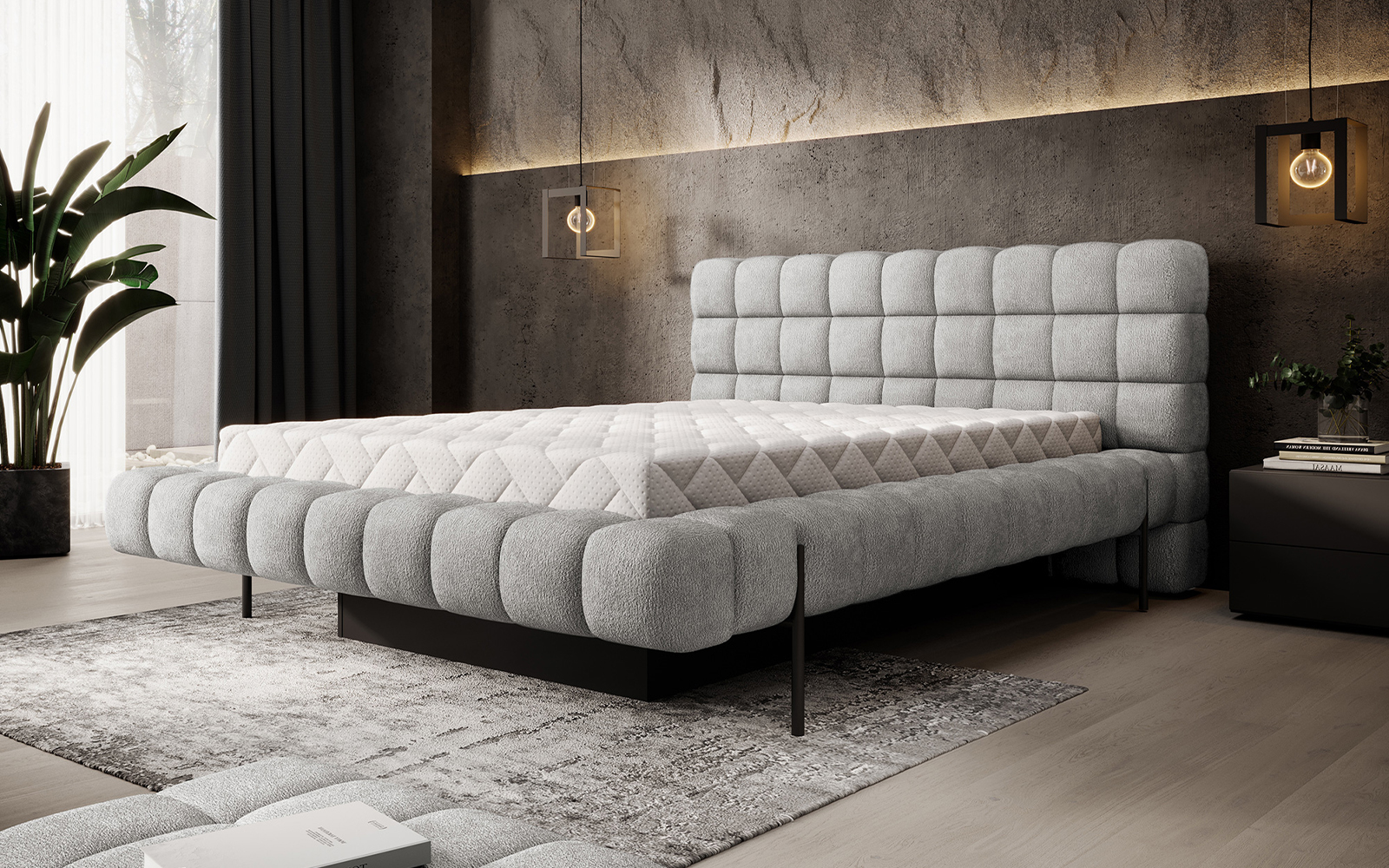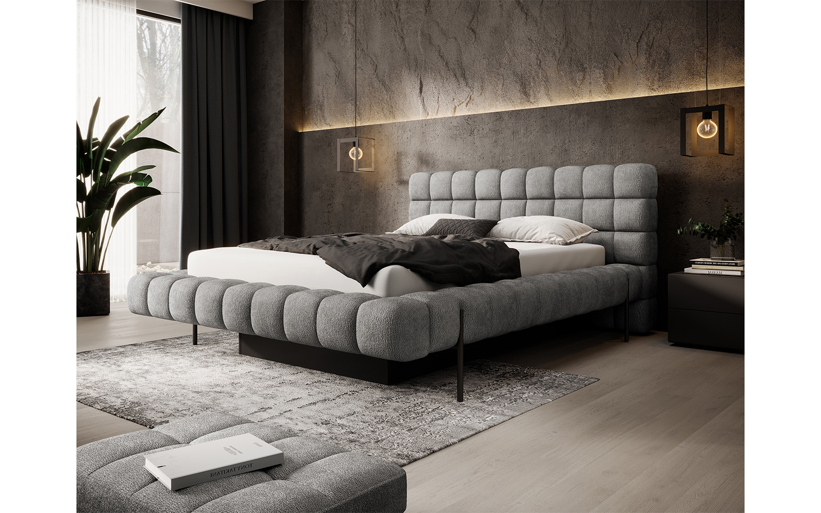 Patul Magentta este o alegere de excepție pentru cei care își doresc un dormitor în care eleganța, confortul și funcționalitatea se completează reciproc într-o manieră perfect echilibrată. Inspirat de liniile minimaliste ale designului contemporan, acest pat se remarcă prin aspectul său geometric matlasat, tăblia înaltă și proporțiile atent studiate, care reușesc să ofere o prezență impunătoare fără a încărca vizual spațiul. Forma modernă este subliniată de tapițeria realizată cu materiale textile de înaltă calitate, ce pot fi alese într-o gamă variată de culori și texturi, pentru a răspunde celor mai diverse preferințe de stil și ambient.