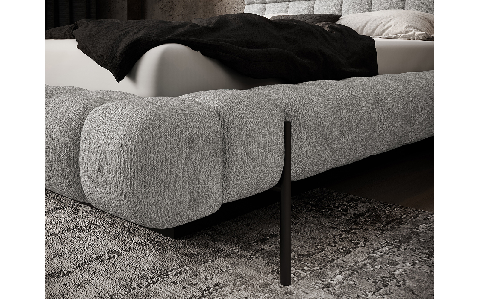 Patul Magentta este disponibil în trei dimensiuni standard – 140×200 cm, 160×200 cm și 180×200 cm – ceea ce îl face potrivit atât pentru dormitoare de dimensiuni mai reduse, cât și pentru spații generoase. Datorită caracterului său personalizabil, modelul poate fi realizat în numeroase nuanțe și materiale din paletarul Eltap, astfel încât să se armonizeze perfect cu restul mobilierului și decorului din încăpere. Picioarele metalice negre adaugă o notă suplimentară de modernitate și accentuează designul aerisit, subliniind eleganța minimală a piesei.