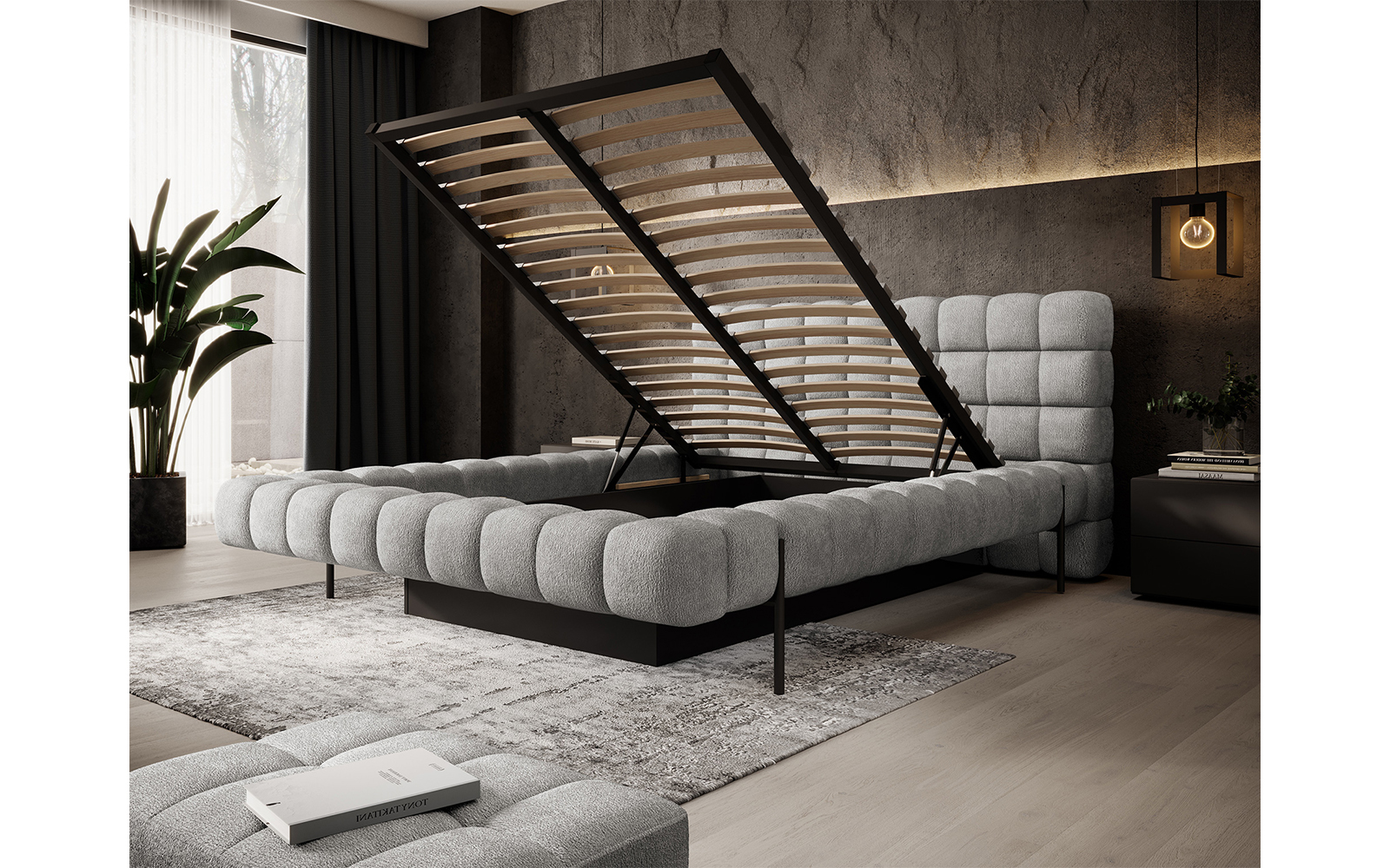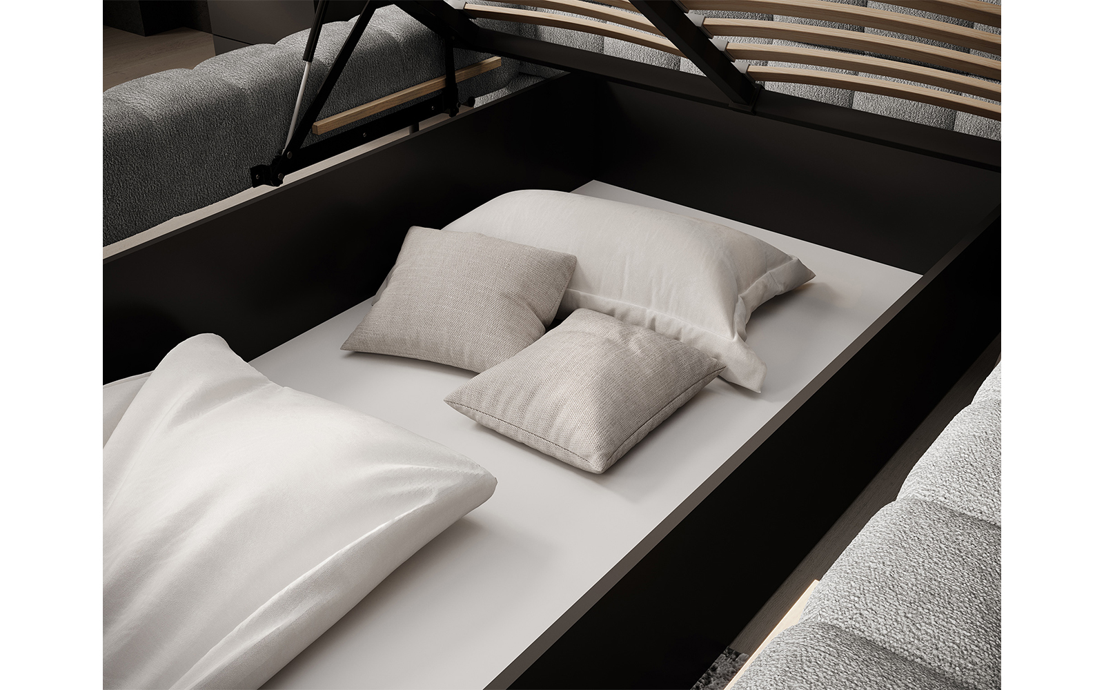 Un alt avantaj major al patului Magentta este lada de depozitare spațioasă, integrată inteligent sub cadru. Aceasta se accesează cu ușurință datorită mecanismului pe gaz, care face ridicarea somierei simplă și lină. Lada devine astfel un spațiu suplimentar extrem de practic pentru păstrarea lenjeriilor, pernelor, plăpumilor sau chiar a obiectelor voluminoase, fiind o soluție discretă și eficientă pentru organizarea dormitorului.