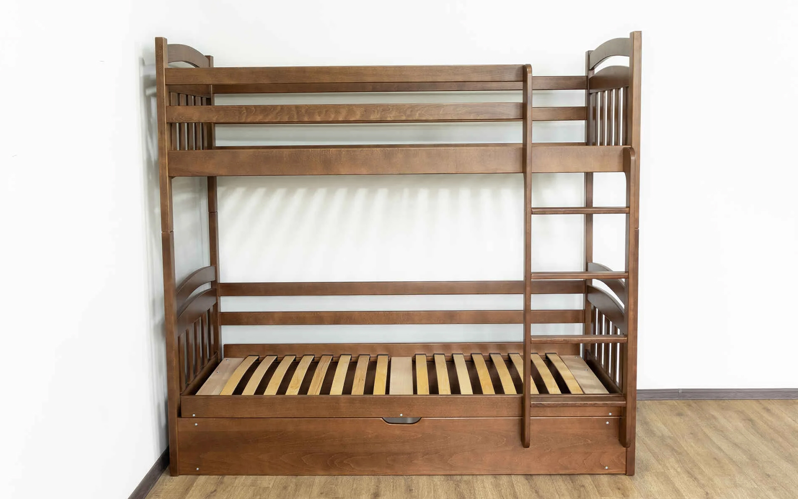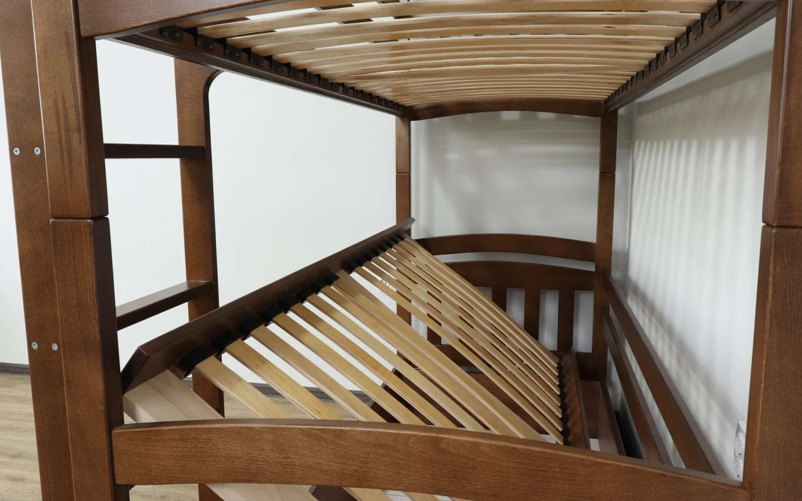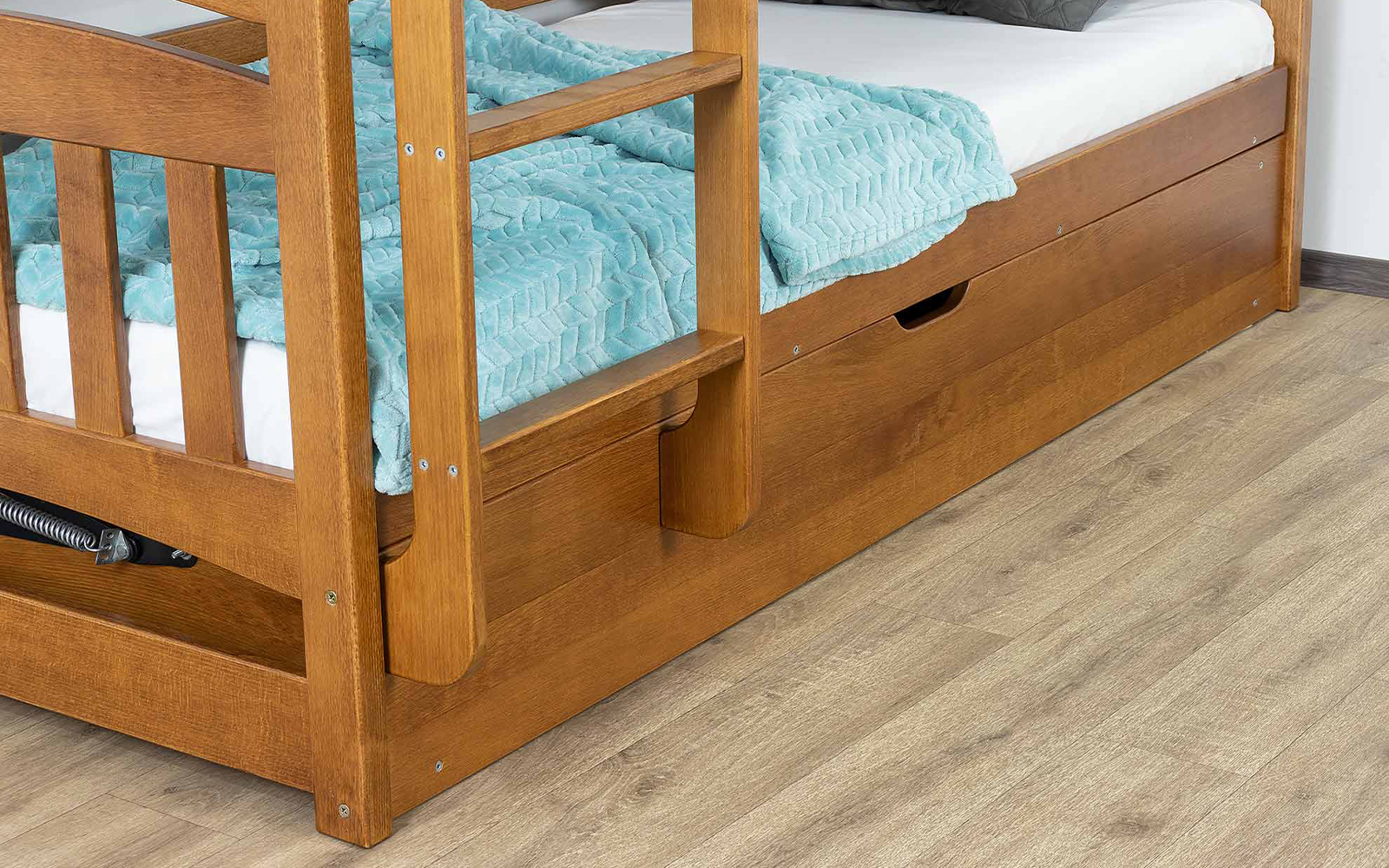 Pentru siguranță, patul superior este prevăzut cu protecții laterale solide, iar baza saltelei este realizată din lamele ortopedice curbate, care asigură susținere corectă și confort optim în timpul somnului.