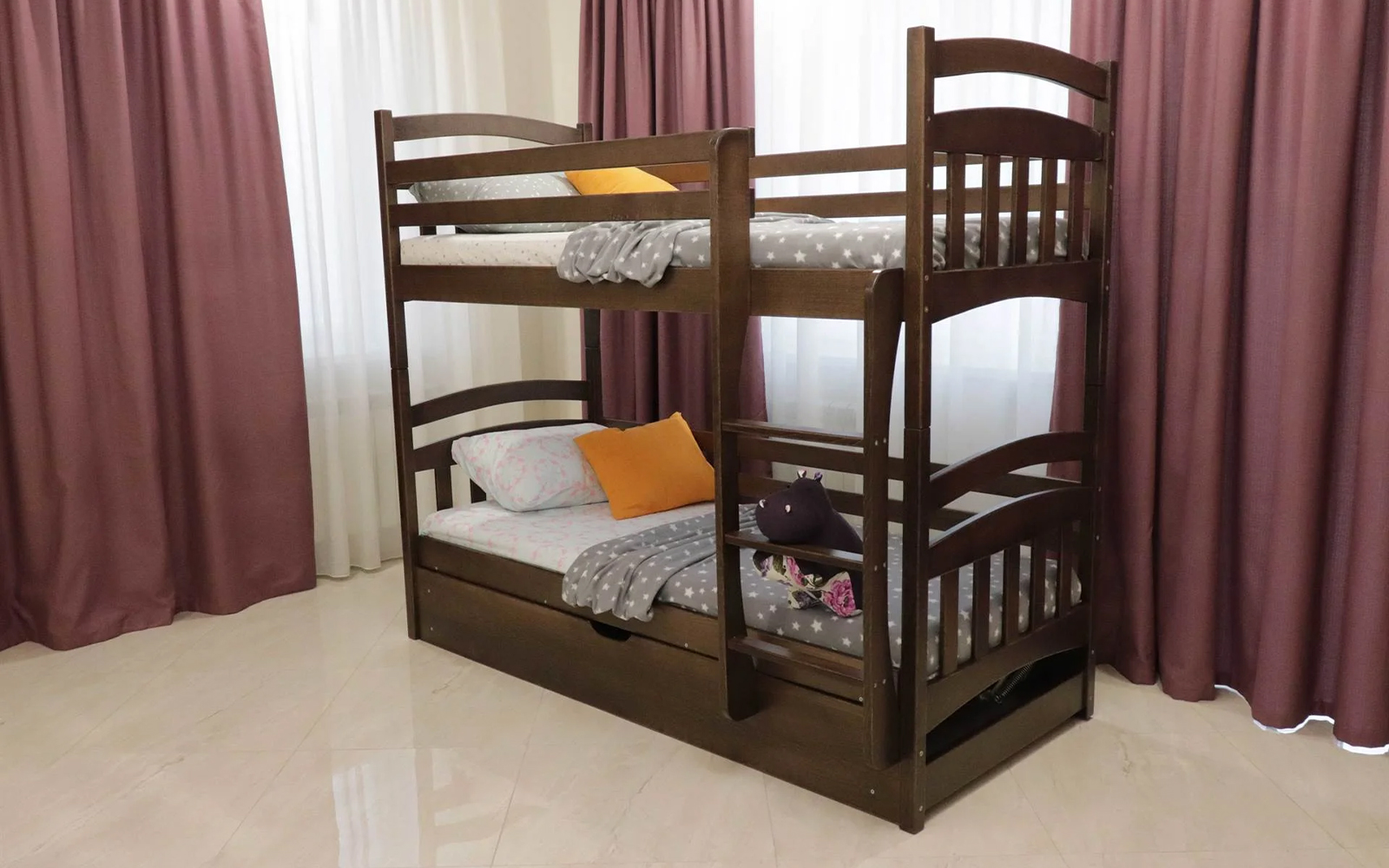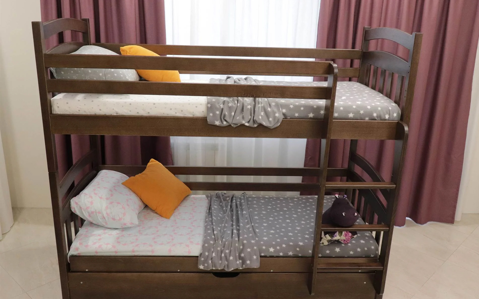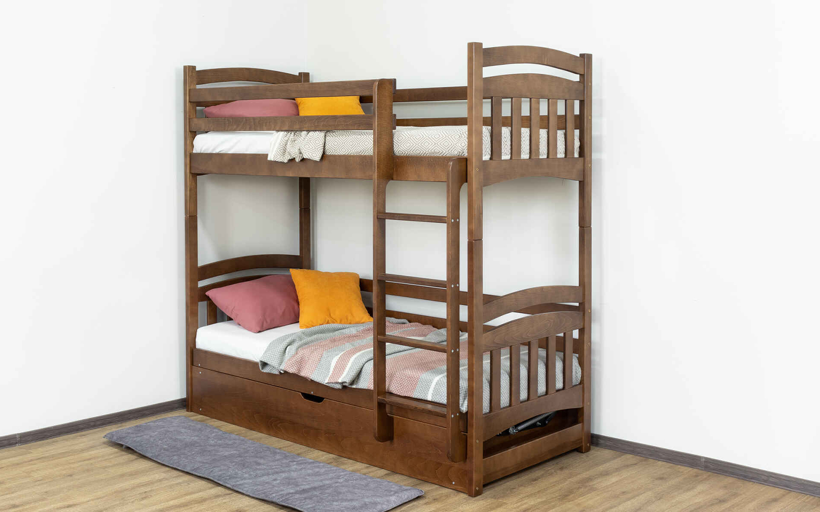 Pentru siguranță, patul superior este prevăzut cu protecții laterale solide, iar baza saltelei este realizată din lamele ortopedice curbate, care asigură susținere corectă și confort optim în timpul somnului.