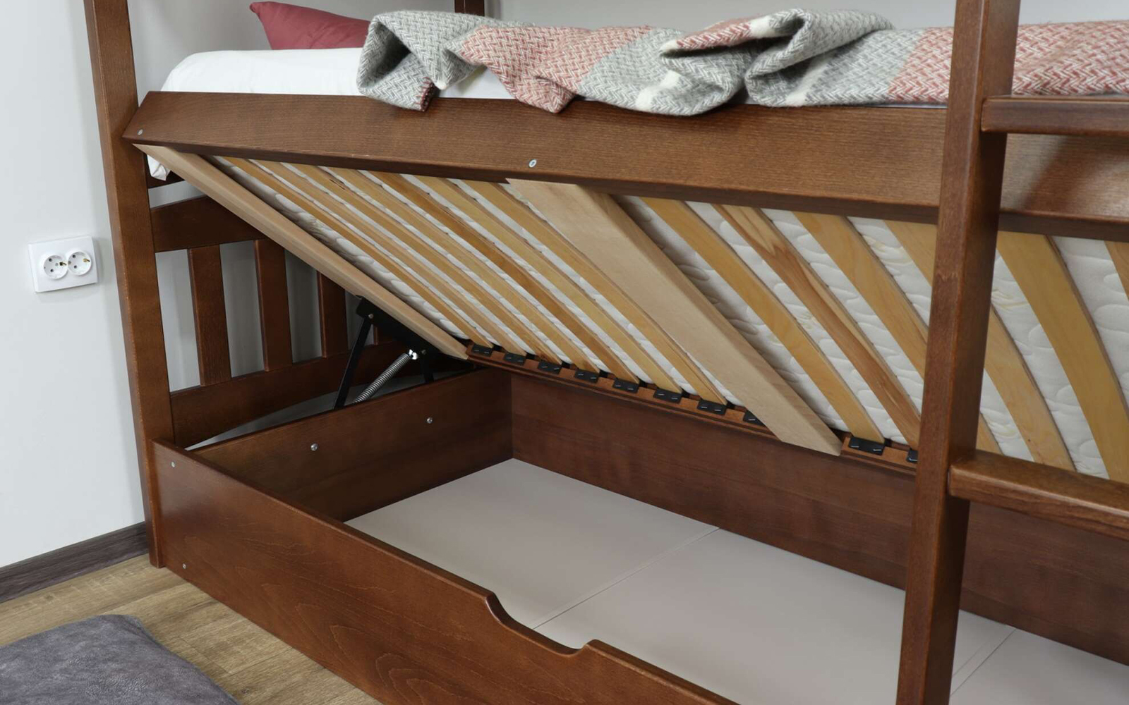 Un element definitoriu al acestui model este sistemul de ridicare integrat pentru patul inferior, care oferă acces facil la spațiul de depozitare. Compartimentul generos de sub pat este ideal pentru depozitarea lenjeriilor, pernelor sau altor obiecte, contribuind la menținerea unui spațiu organizat și eficient.