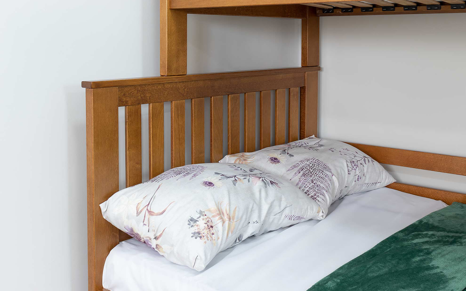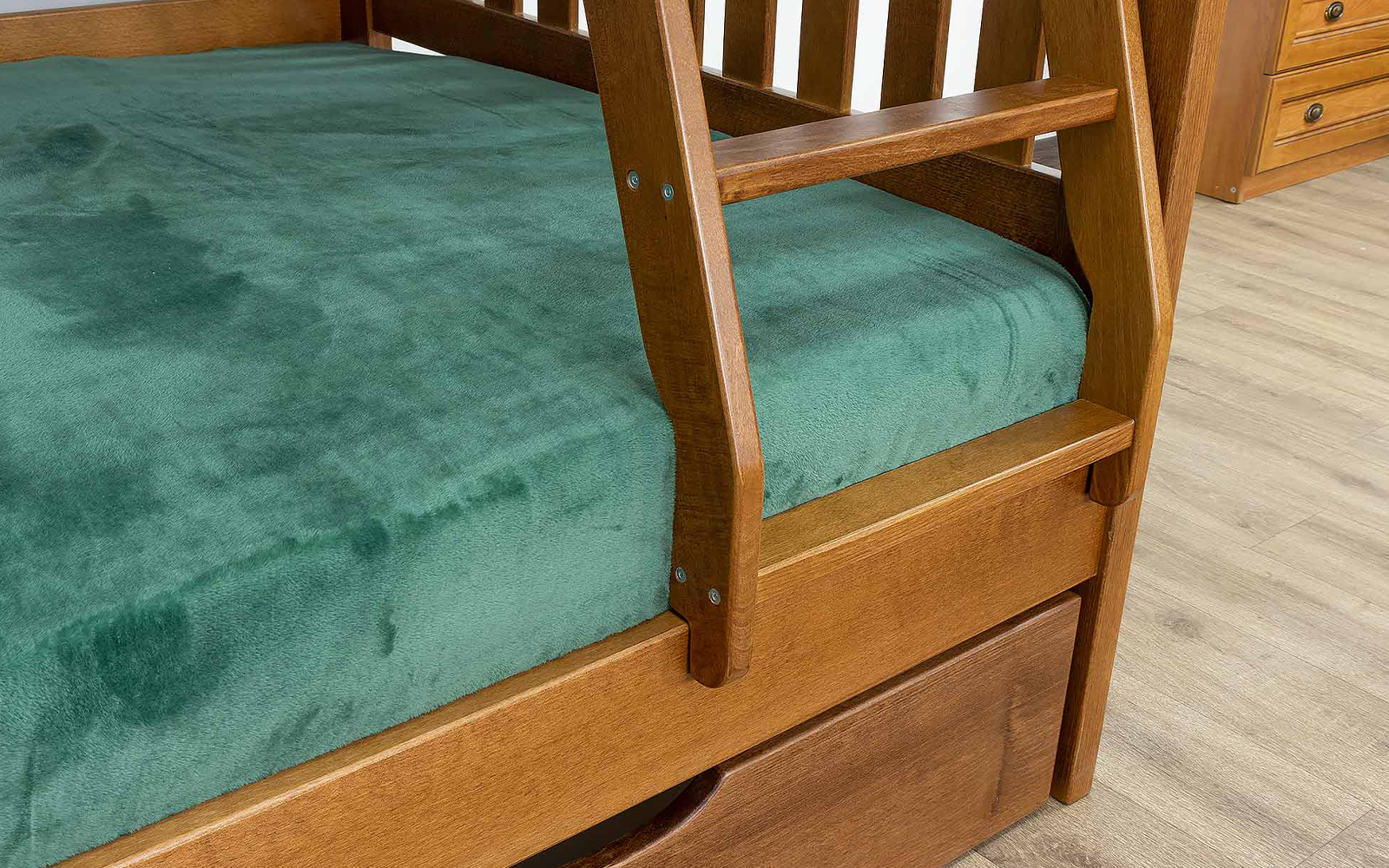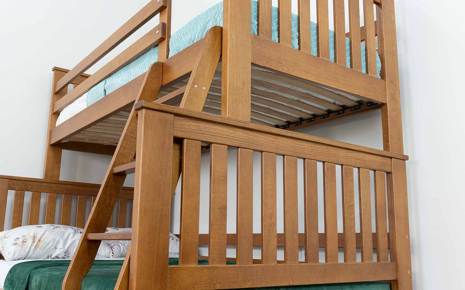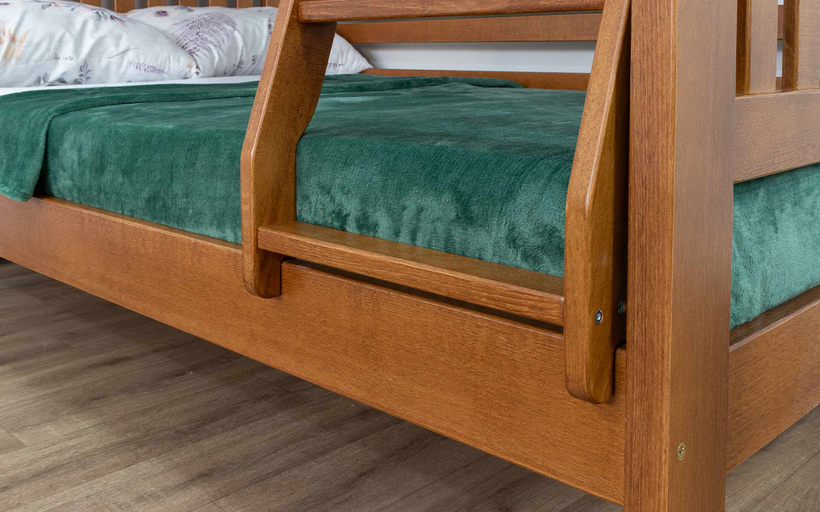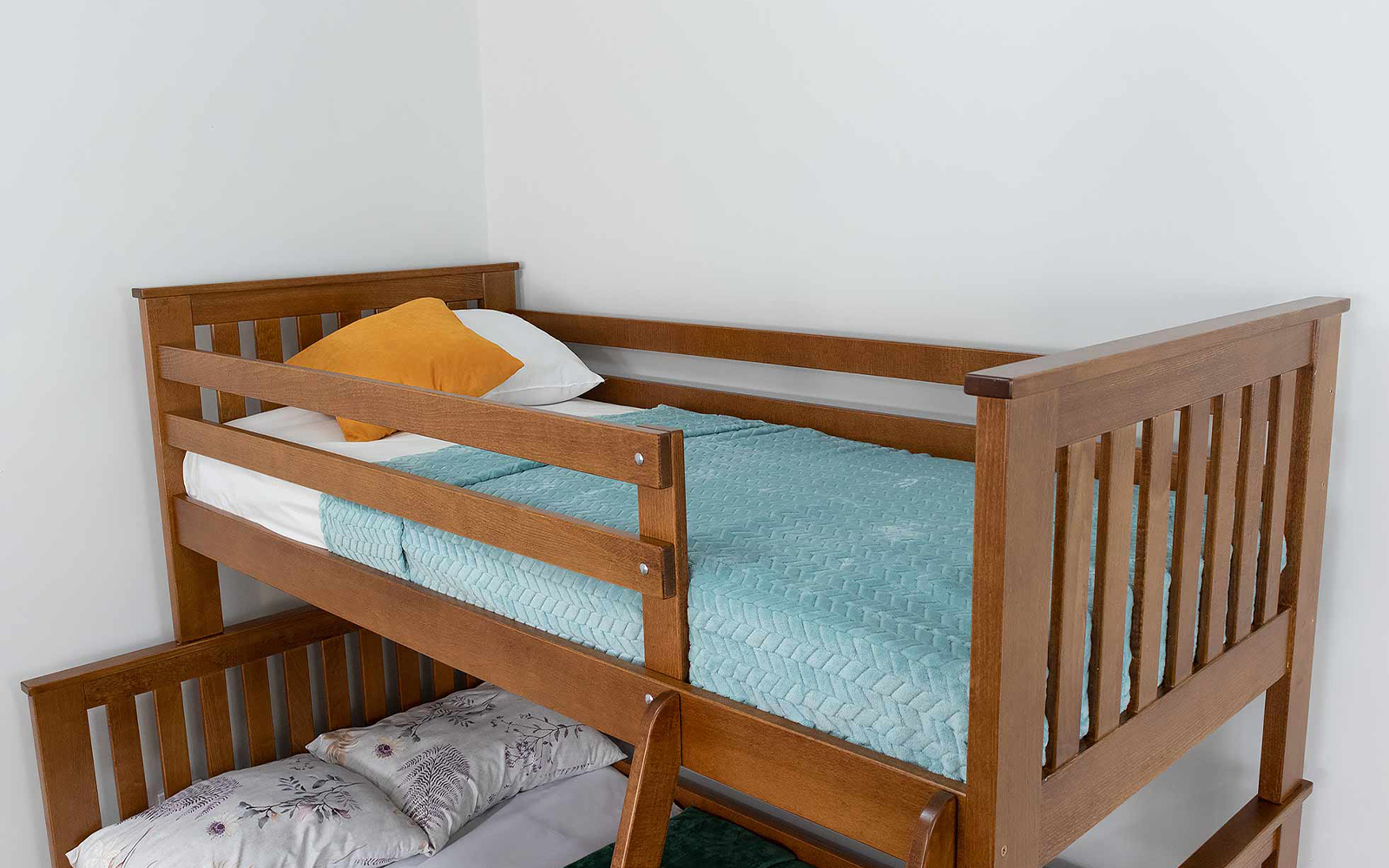 Pentru siguranță, patul superior este prevăzut cu protecții laterale solide, iar baza saltelei este realizată din lamele ortopedice curbate, care asigură susținere corectă și confort optim în timpul somnului.