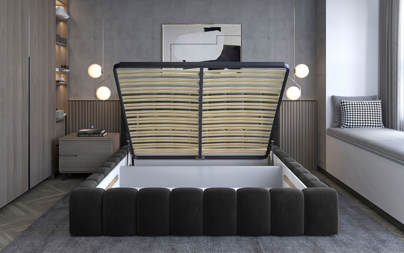 Structura patului este bazată pe un cadru metalic robust, completat de un mecanism de ridicare pe gaz, ce facilitează accesul la cele două compartimente de depozitare ascunse. Acestea sunt spațioase și practice, perfecte pentru organizarea lenjeriei, pernelor sau a păturilor, optimizând astfel spațiul disponibil din dormitor.