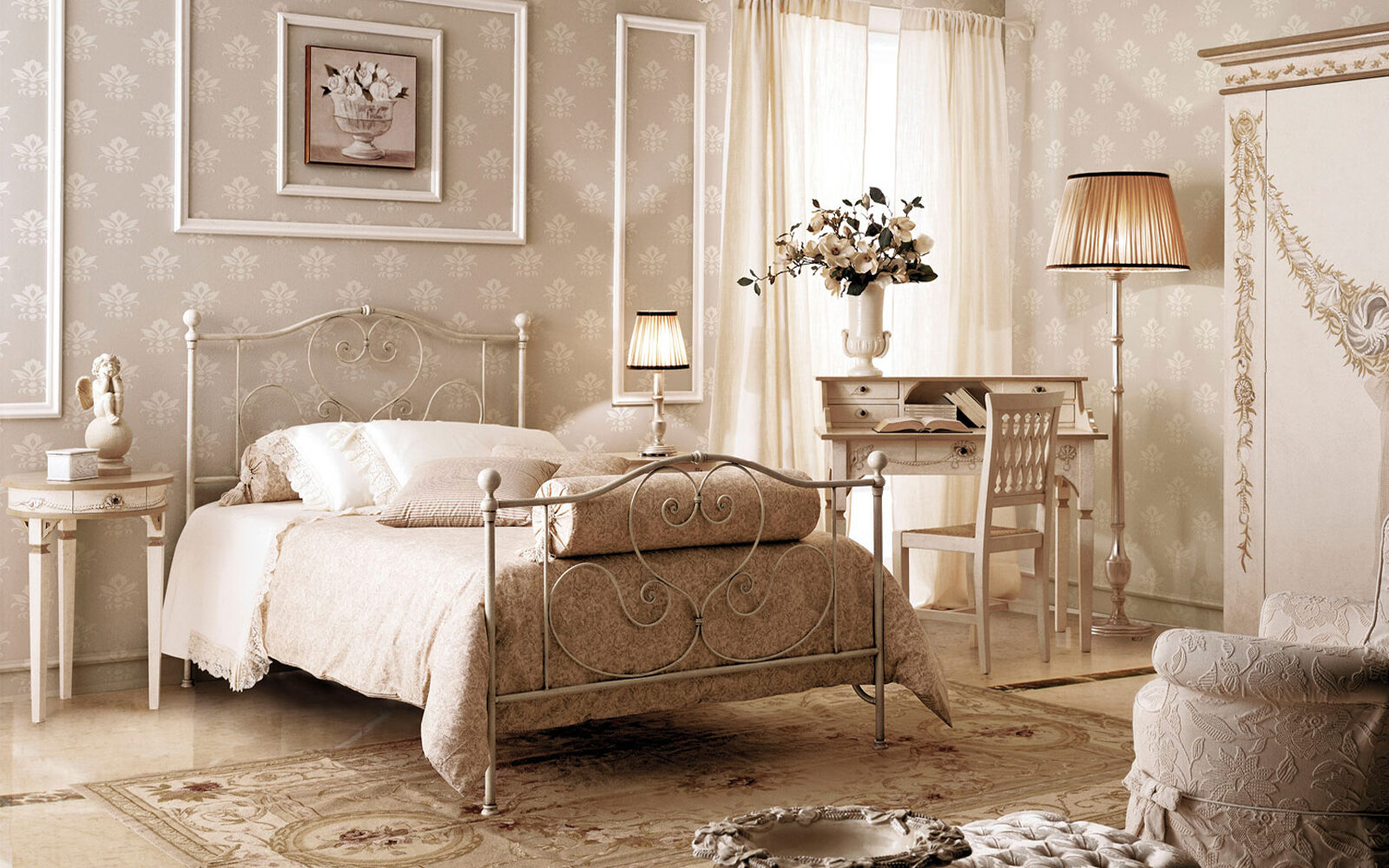 Fiecare pat Virginia este disponibil într-o paletă variată de finisaje pictate manual, în funcție de categoria aleasă, de la alburi antichizate până la nuanțe aurii, care pot fi adaptate pentru a se potrivi oricărui decor romantic. Această piesă este mai mult decât un simplu pat – este o declarație de stil, o prezență armonioasă care transformă spațiul într-un adevărat colț de poveste.