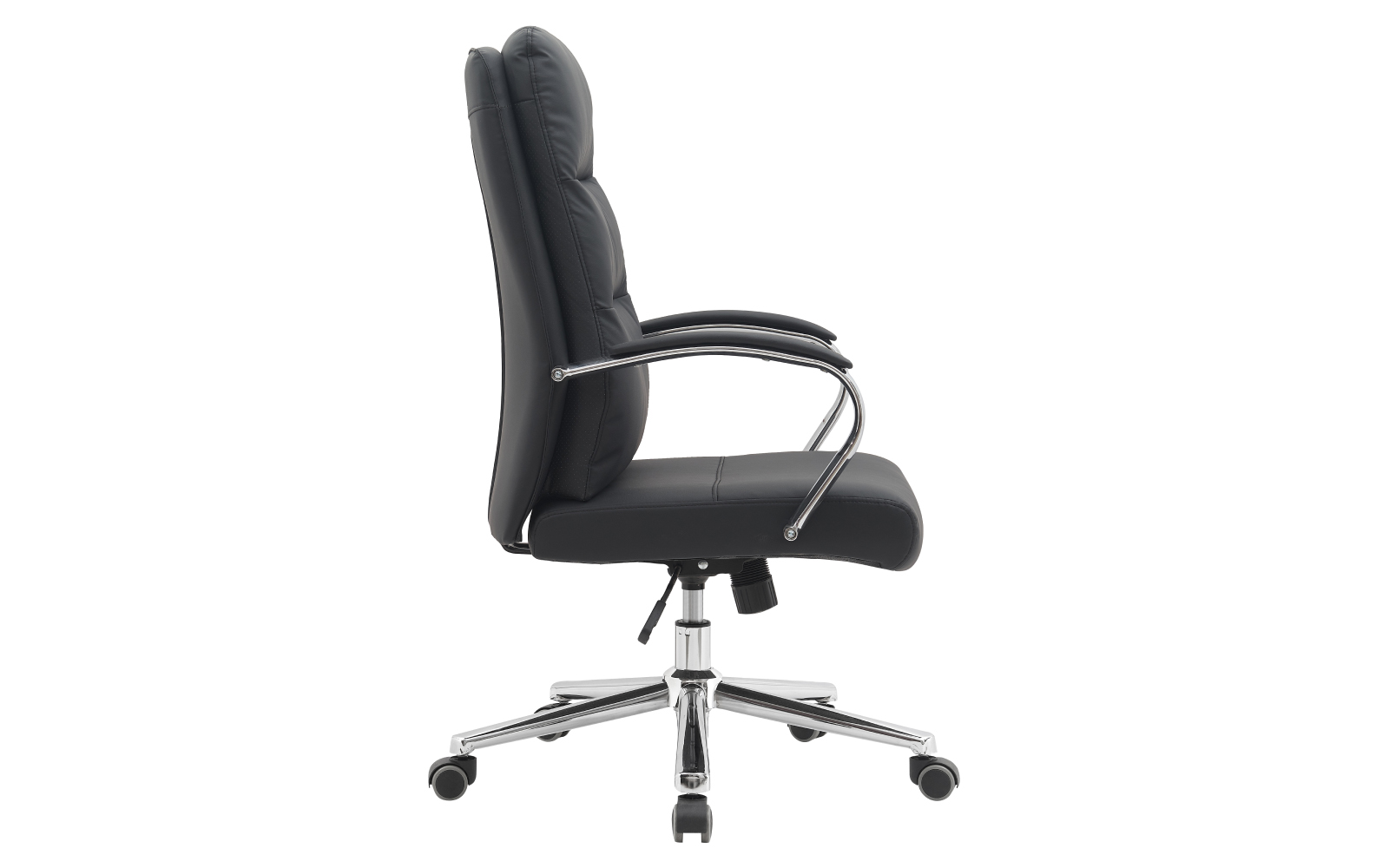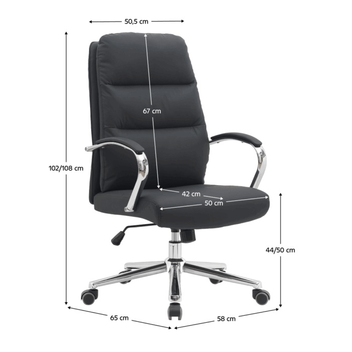 Tapițeria din piele ecologică (PU) de calitate superioară are un aspect impecabil, este plăcută la atingere și foarte ușor de întreținut, făcând scaunul ideal pentru utilizare zilnică intensă. Spătarul înalt oferă sprijin corect pentru zona lombară și cea superioară a spatelui, contribuind la o postură sănătoasă în timpul orelor petrecute la birou. Șezutul este confortabil, bine conturat, iar cotierele tapițate completează experiența de utilizare, oferind relaxare și reducând presiunea asupra umerilor.