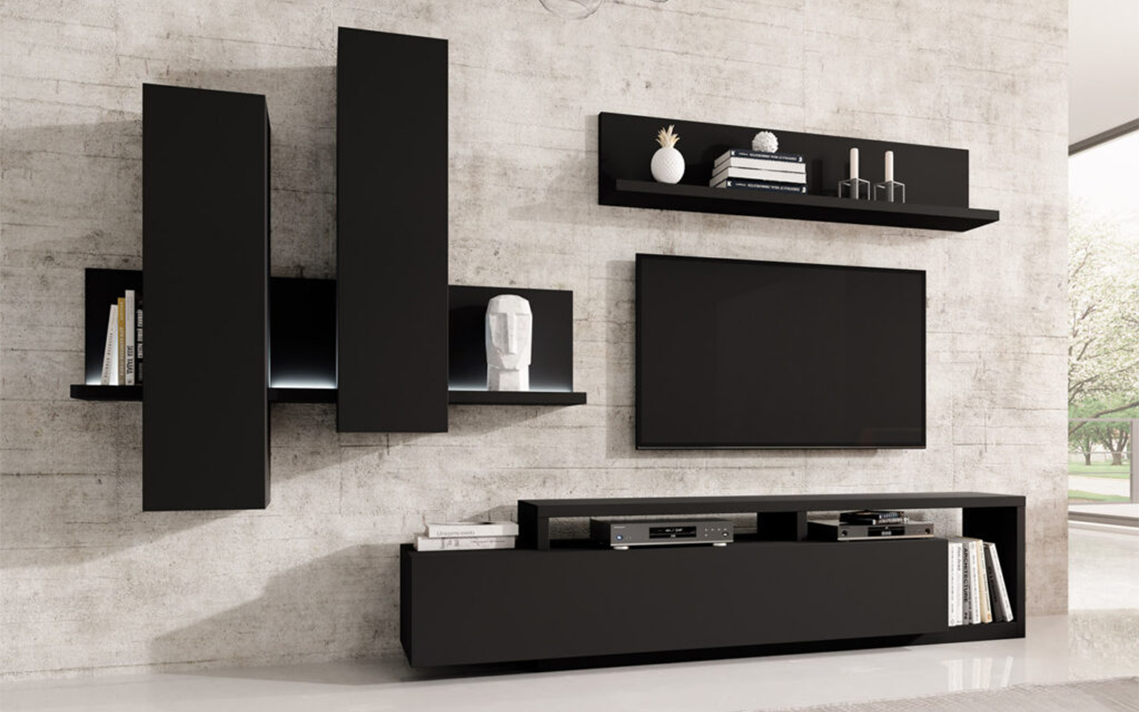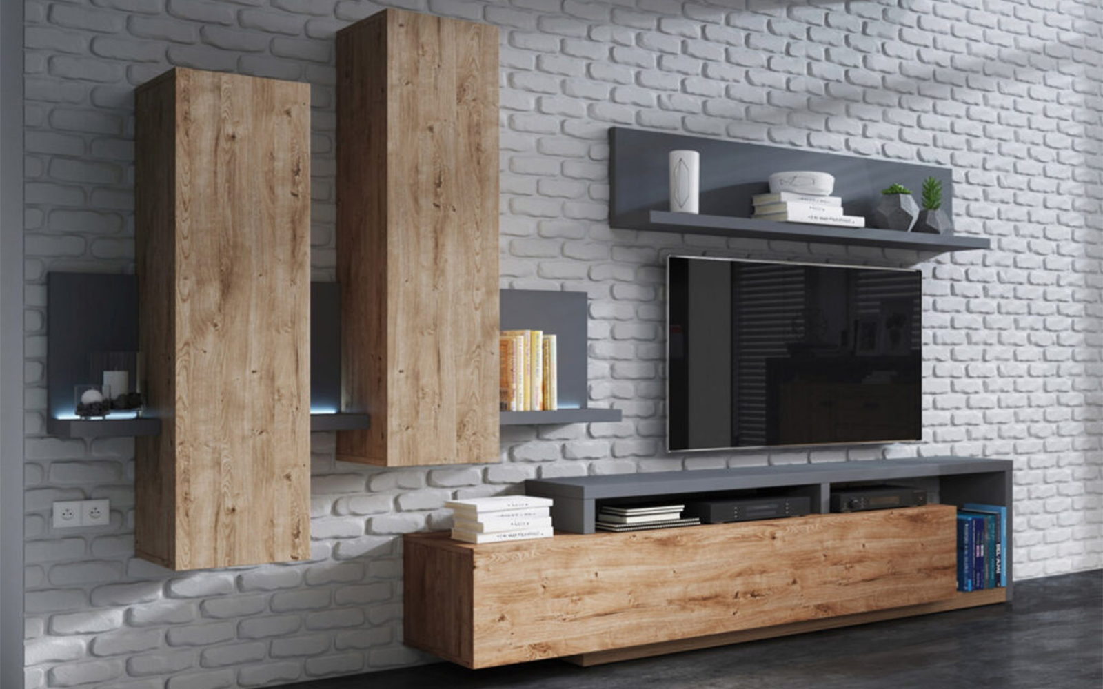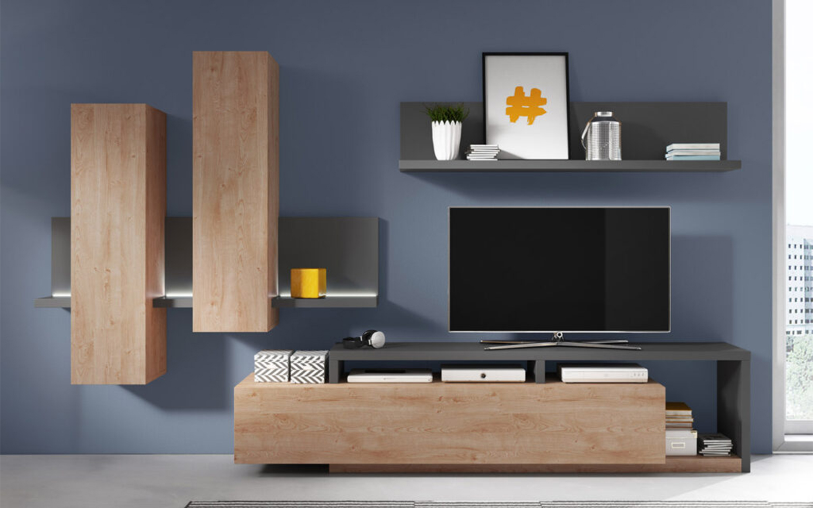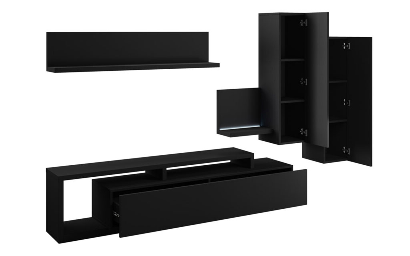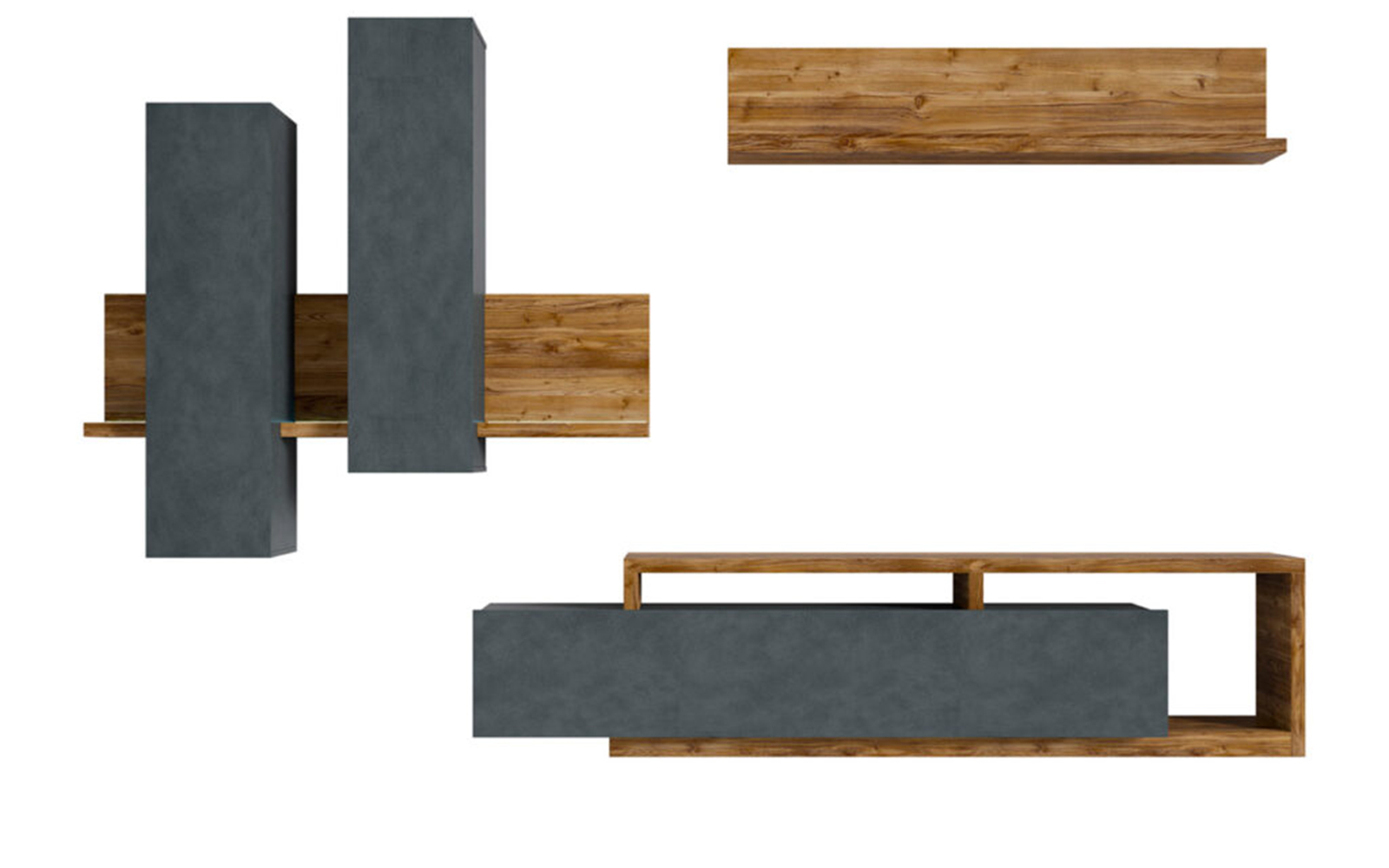 Setul include atât corpuri închise, ideale pentru depozitarea discretă a obiectelor personale, cât și zone deschise care pot fi utilizate pentru expunerea cărților, obiectelor decorative, fotografiilor sau elementelor multimedia. Această combinație de spații închise și deschise contribuie la menținerea unui aspect ordonat, dar în același timp personalizat și dinamic.