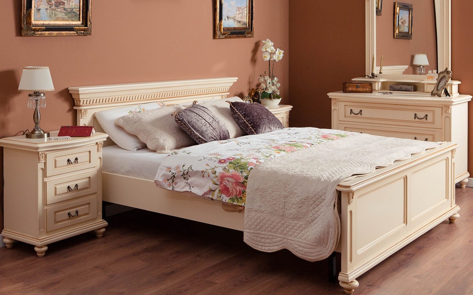 Set Dormitor Roberta, Lemn Masiv, Crem Patinat