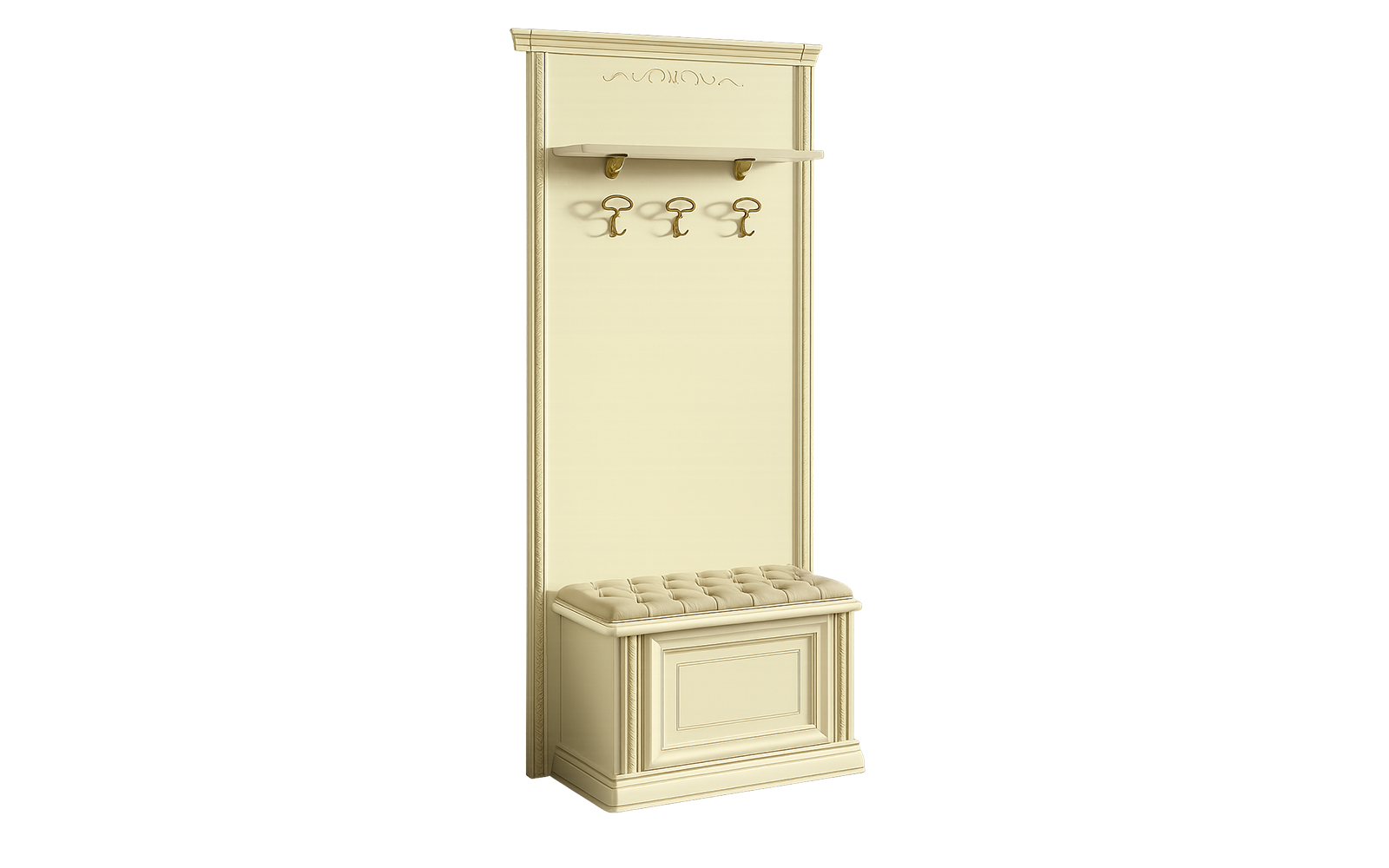 Cu un design inspirat din farmecul clasic al mobilierului italian, setul Caterina este compus dintr-o băncuță practică cu șezut tapițat și un cuier vertical cu poliță superioară, realizate într-un finisaj sofisticat de crem antichizat. Această nuanță delicată, completată de detaliile fine ale fronturilor, conferă piesei o eleganță atemporală, potrivită atât interioarelor clasice, cât și celor moderne cu accente vintage.
