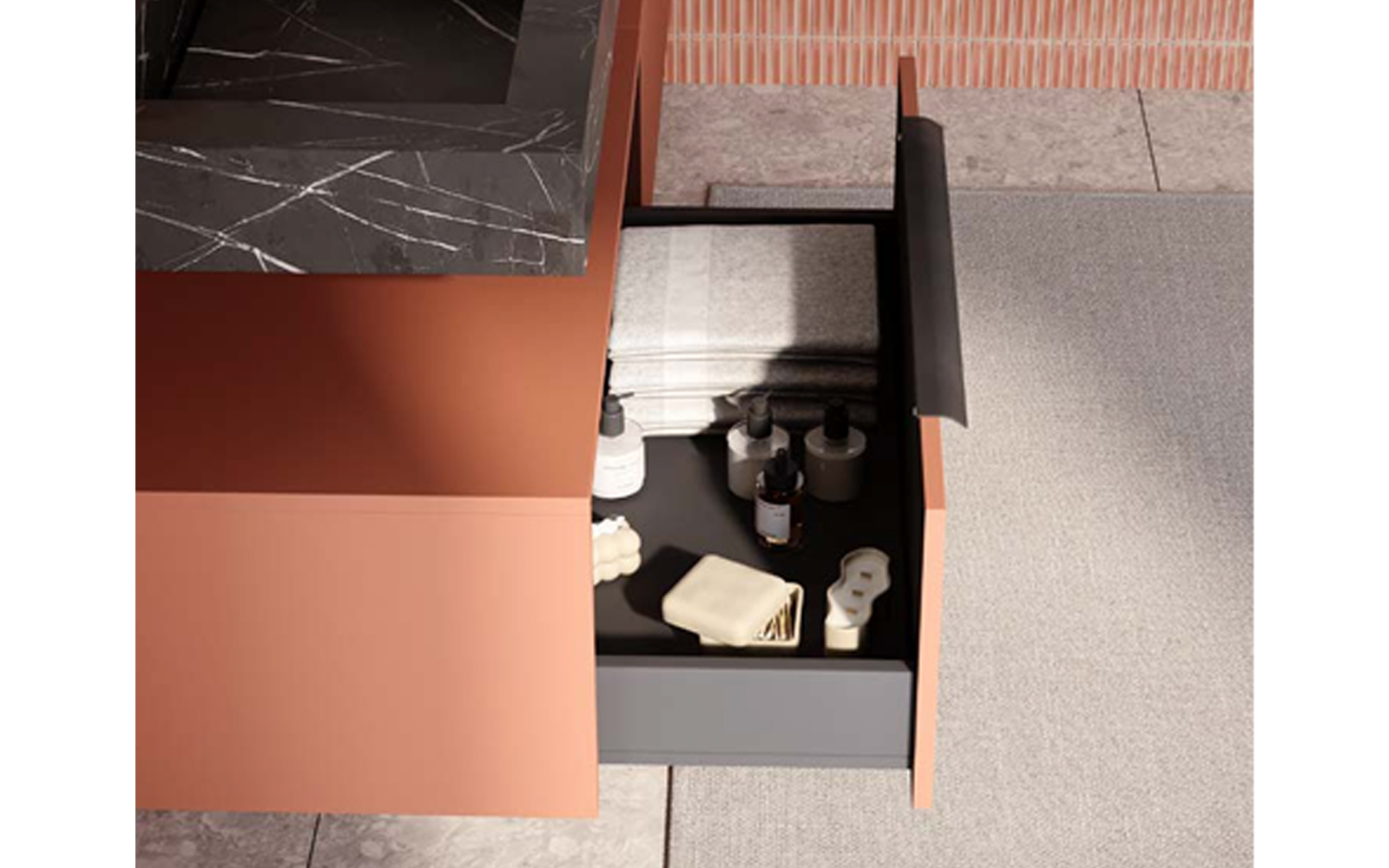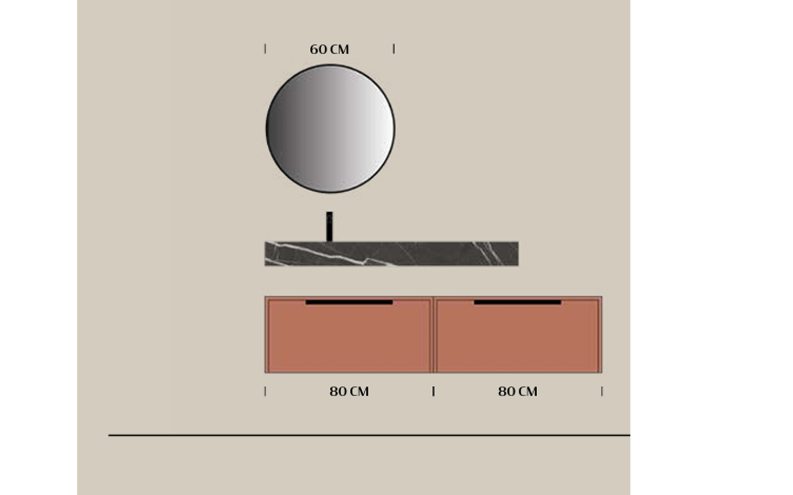 Comoda este alcătuită din două corpuri modulare de câte 80 cm, prevăzute cu sertare spațioase ce permit depozitarea organizată a obiectelor esențiale din baie. Sistemul suspendat facilitează curățarea pardoselii și accentuează senzația de spațiu liber, fiind ideal inclusiv pentru băile de dimensiuni medii. Blatul rezistent din HPL integrează elegant lavoarul cu poziționare asimetrică pe partea dreaptă, oferind atât rezistență la umiditate și uzură, cât și un aspect premium, ușor de întreținut în utilizarea zilnică.