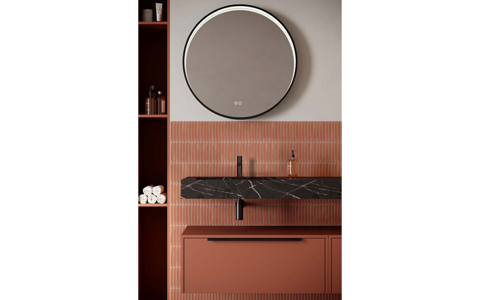 Oglinda rotundă cu iluminare LED, cu diametrul de 60 cm, completează armonios ansamblul și adaugă profunzime vizuală spațiului. Lumina uniformă contribuie la confortul utilizării zilnice, fiind ideală pentru activități precum machiajul sau îngrijirea personală, în timp ce forma circulară echilibrează liniile drepte ale mobilierului.
