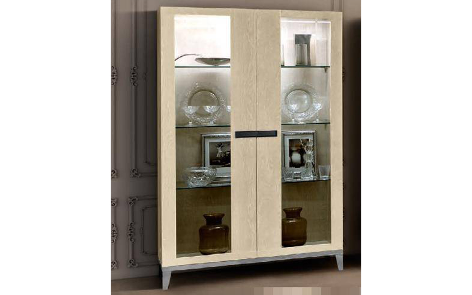 • Vitrină elegantă cu 2 uși, laterale din lemn
