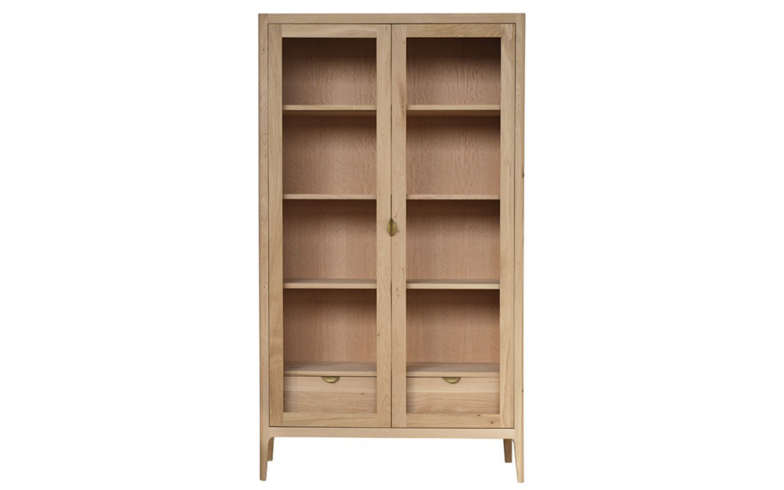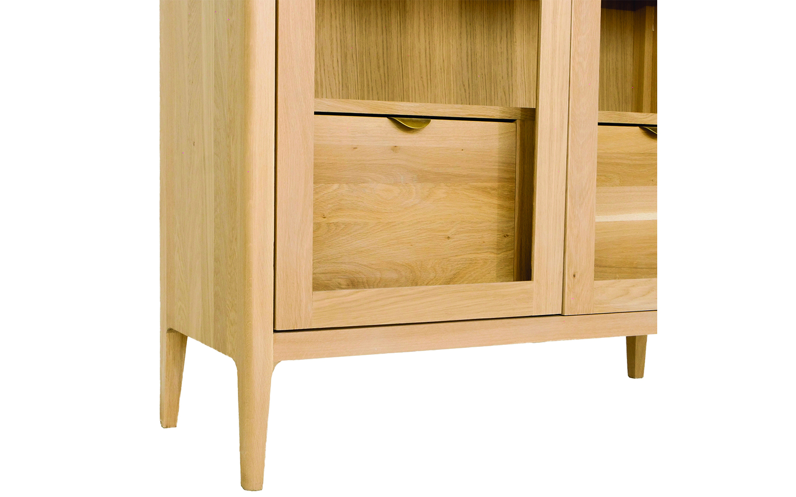 • Vitrină realizată integral din stejar masiv, cu finisaj natural ce evidențiază fibra autentică a lemnului