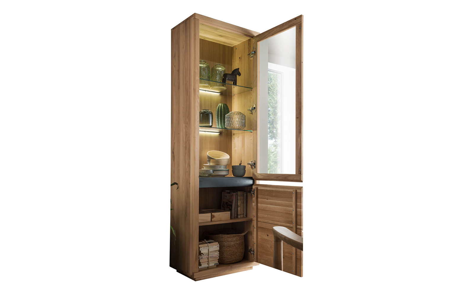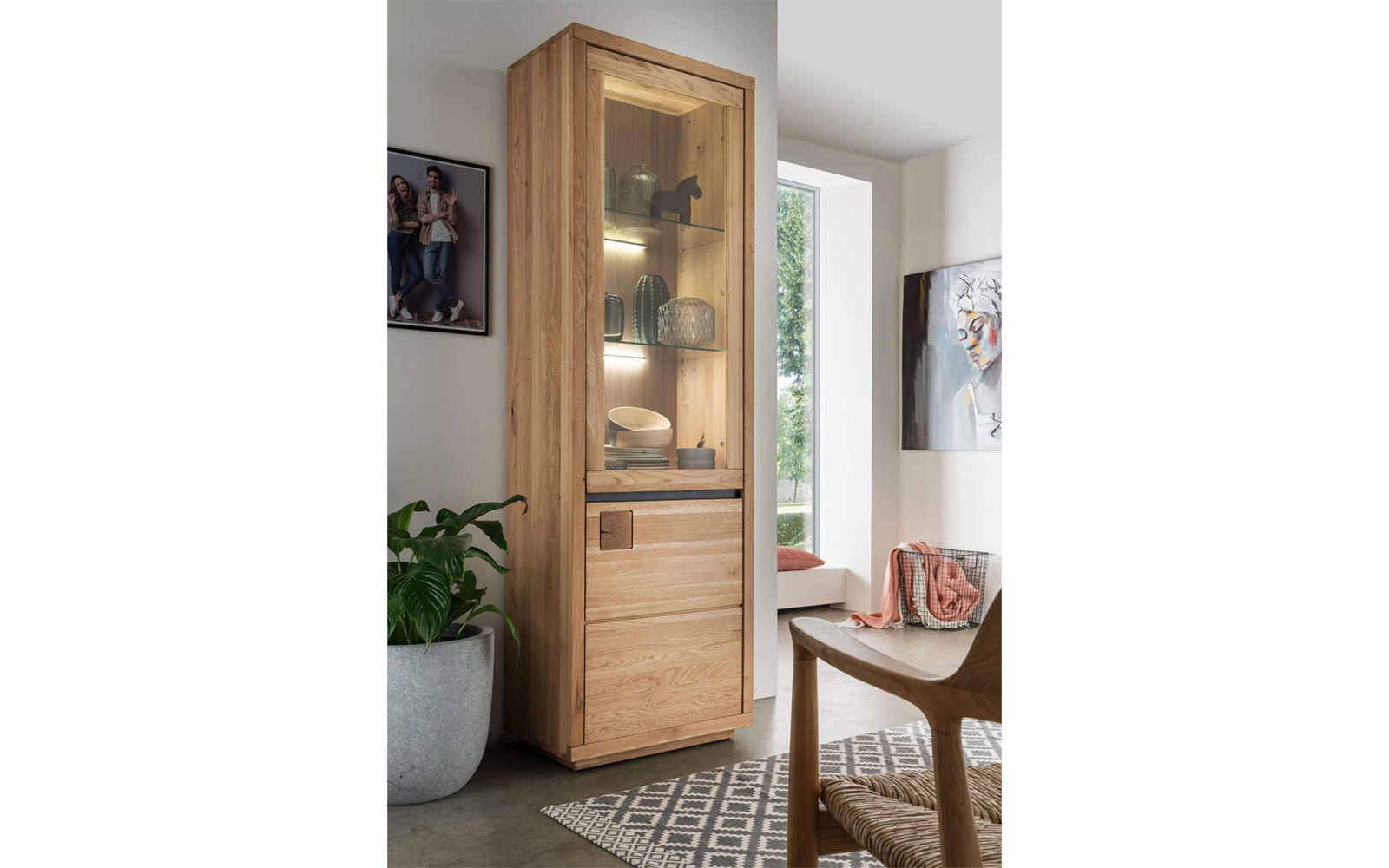 Vitrina I din colecția Urban Loft este o piesă de mobilier elegantă și versatilă, concepută pentru a aduce echilibru între funcționalitate și estetică rafinată. Realizată în întregime din lemn masiv de stejar, păstrează frumusețea naturală a fibrelor, nodurilor și variațiilor de culoare, fiecare detaliu fiind unic și imposibil de reprodus. Suprafața este protejată cu ulei incolor mat, care asigură rezistență în timp și scoate în evidență textura autentică a stejarului.