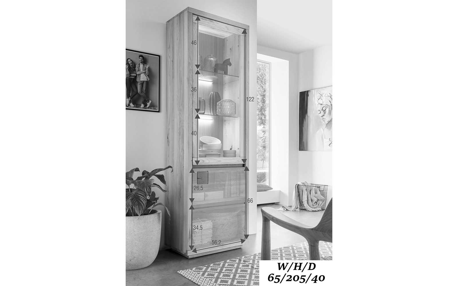 Cu dimensiuni de 65×205×40 cm și o greutate de 60,5 kg, această vitrină îmbină perfect durabilitatea, designul contemporan și funcționalitatea, fiind o alegere ideală pentru livinguri, sufragerii sau chiar spații open-space decorate în stil modern și loft.