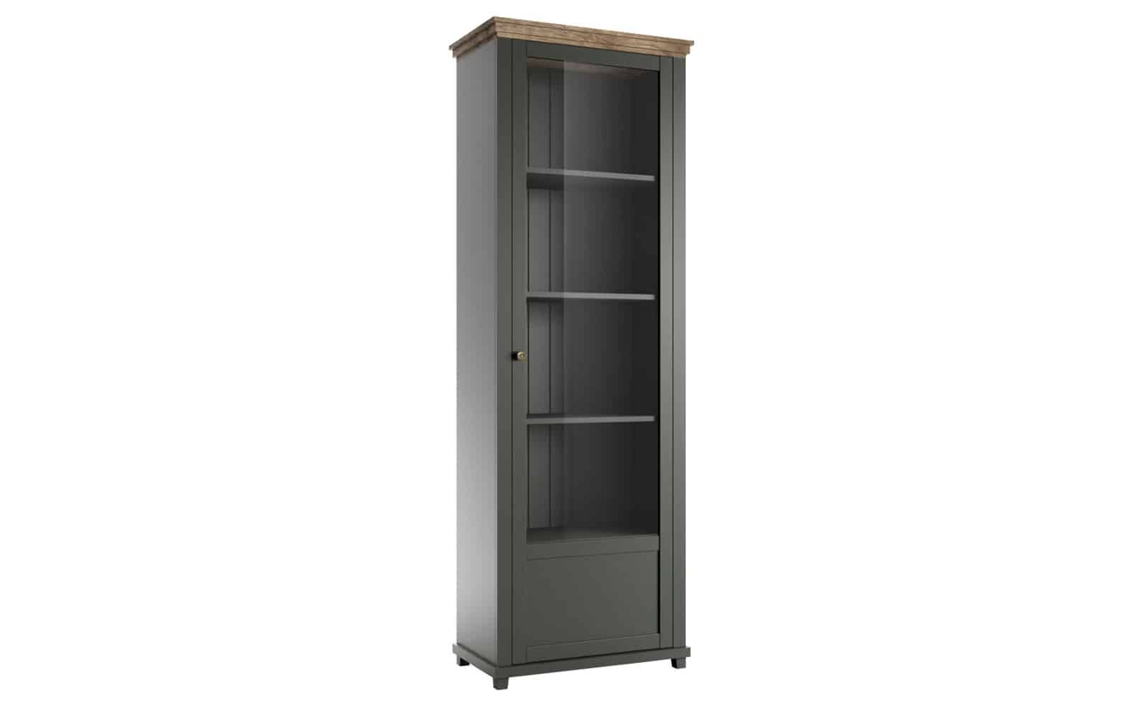 Vitrina Jardon cu o ușă și geam în finisaj grafit este o piesă de mobilier care emană rafinament și stabilitate, fiind realizată integral din lemn masiv pentru un plus de durabilitate și rezistență. Nuanța profundă de grafit, combinată armonios cu blatul superior în ton natural de lemn, creează un contrast plin de eleganță, potrivit pentru spațiile contemporane, dar și pentru cele amenajate în stil clasic sau eclectic.