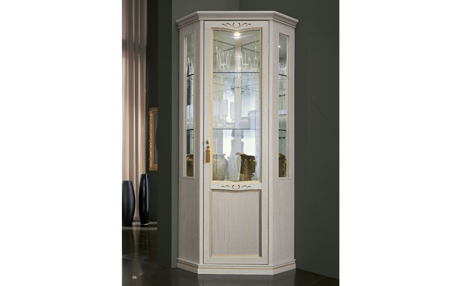 Această vitrină de colț este alegerea perfectă pentru livinguri, sufragerii sau holuri unde se dorește combinarea eleganței clasice cu o utilizare eficientă a spațiului. Datorită construcției solide, a designului rafinat și a iluminării integrate, devine rapid o piesă centrală care atrage privirile și conferă încăperii un farmec aparte.