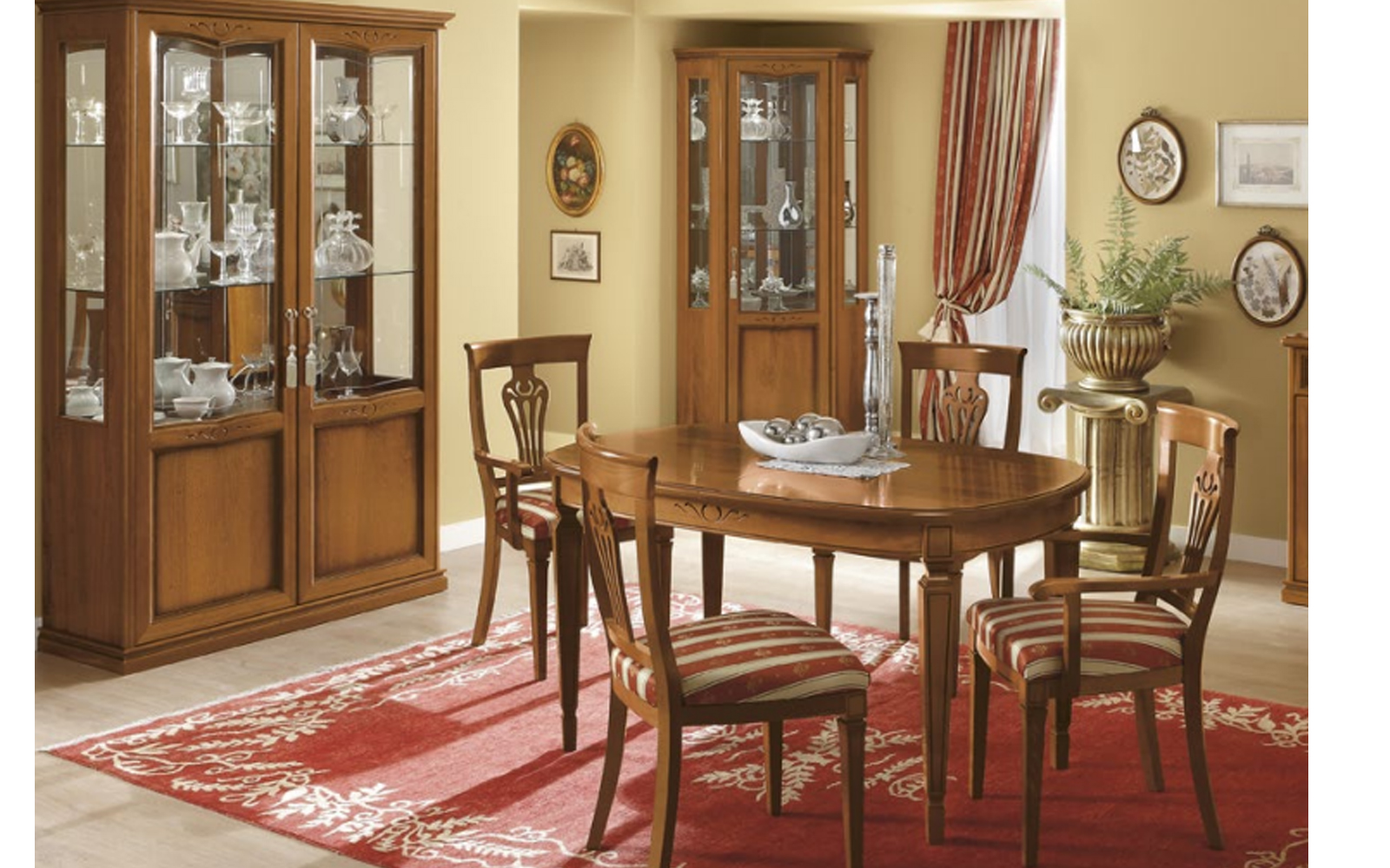 Realizată din lemn masiv de înaltă calitate, această vitrină se remarcă prin rezistență, stabilitate și atenția acordată detaliilor. Finisajele sunt disponibile în două variante elegante — nuc, cu nuanțe calde și profunde potrivite pentru interioare clasice sau rustice, și crem, o alegere luminoasă și delicată pentru decoruri elegante sau romantice. Aceste opțiuni permit integrarea ușoară a piesei într-o varietate de stiluri de amenajare: clasic italian, rustic elegant, eclectic sau vintage.