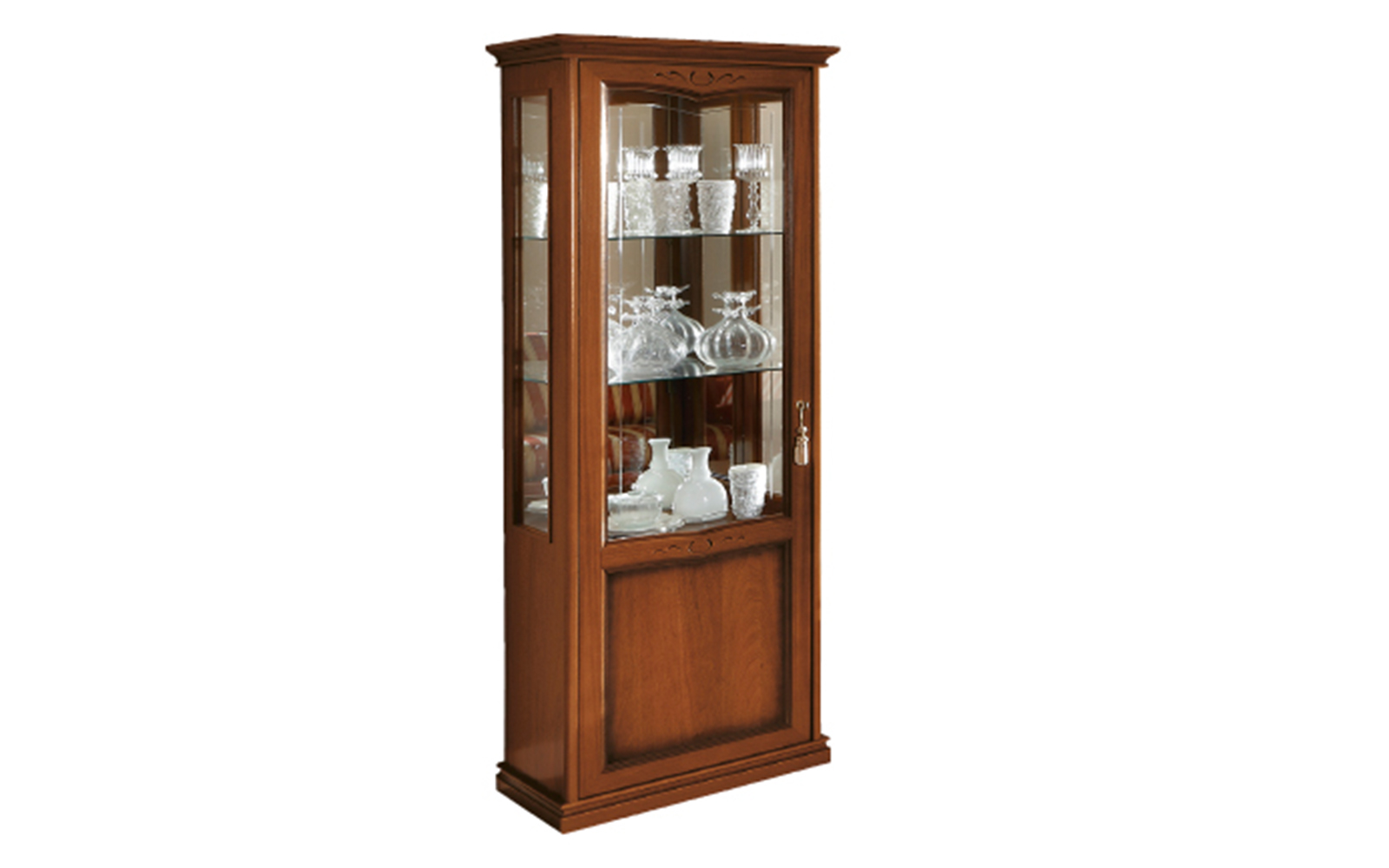 Fațada vitrinei este realizată din sticlă transparentă de calitate, încadrată elegant în lemn masiv, ceea ce permite expunerea clară și elegantă a conținutului interior. Ușa poate fi aleasă cu deschidere pe partea dreaptă sau stângă, oferind flexibilitate la montaj și posibilitatea de a adapta piesa la configurația încăperii.