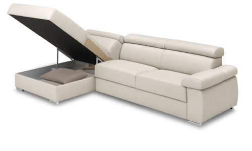 Compoziție modulară personalizabilă, formată din: un loc fix, un loc cu extensie de tip delfin și un șezlong generos cu ladă de depozitare