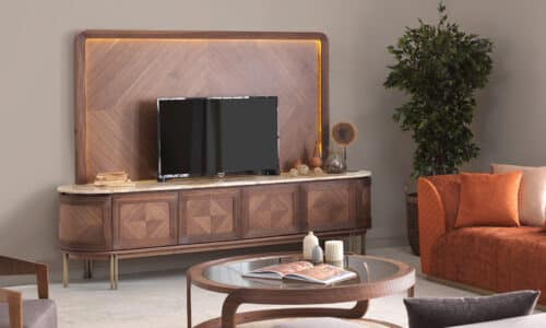 Prețul inițial a fost: 50.600,00 lei.37.469,00 leiPrețul curent este: 37.469,00 lei.Set Living Emma, Nuc – Marmură Naturală 245x56x173cm